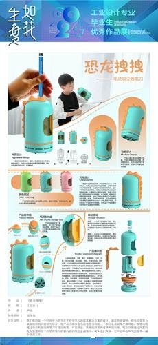 通过三年工业设计专业课程的学习,如:《产品造型设计Rhino》《产品设计执行》《产品设计表达》《产品结构材料工艺设计》《产品创新设计》等工业设计专业核心课程,学生掌握产品设计手绘、Rhino、Creo三维建模、KeyShot三维渲染、PS图像处理及AI全流程辅助设计等实操技能后,完成了毕设作品“恐龙拽拽——电动吸尘卷笔刀”。